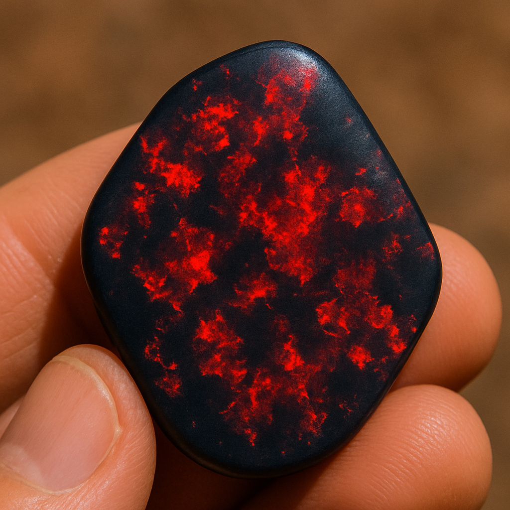 Massive stock of premium-grade red-on-black rough / rubbed / polished opals.