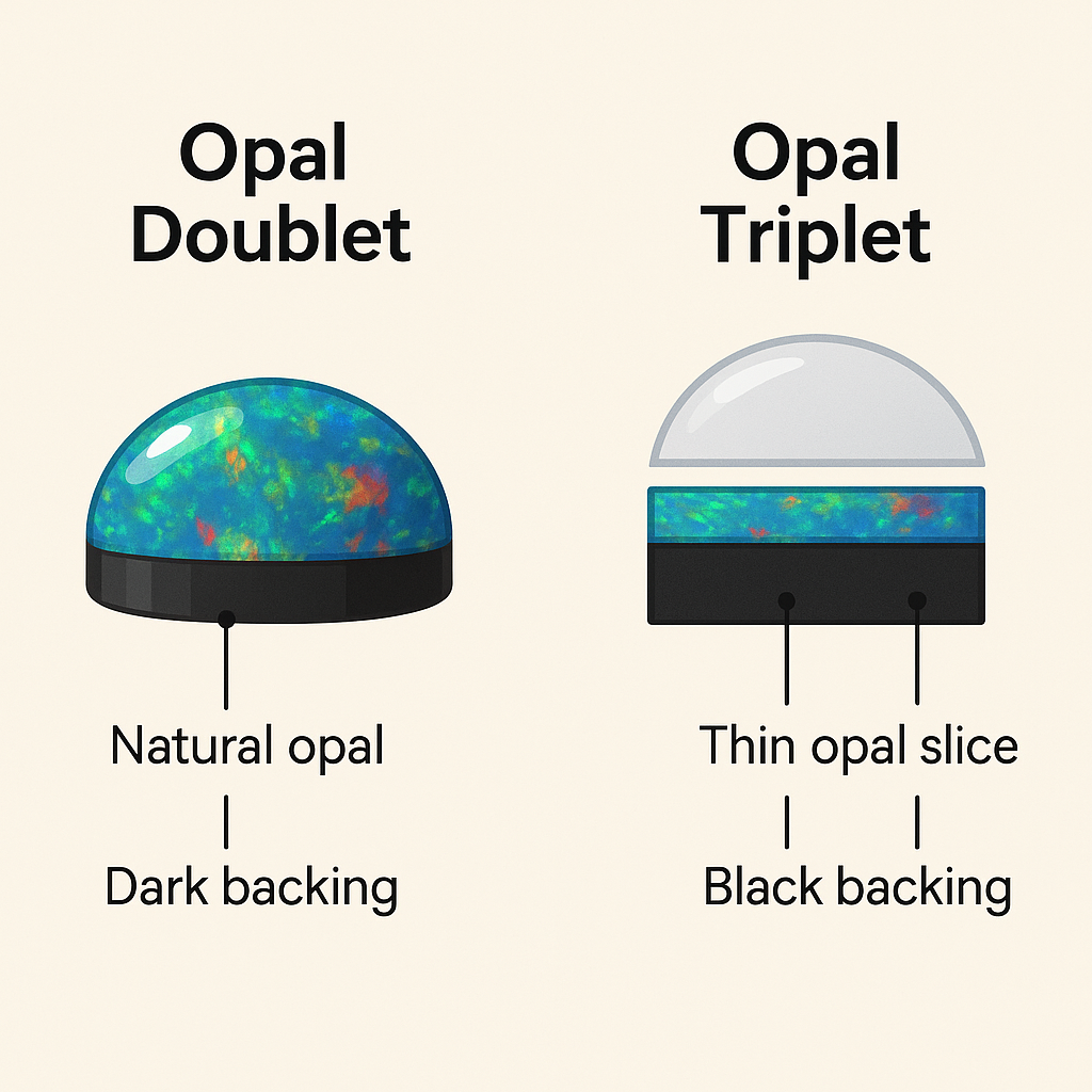 Opal doublets and triplets are composite stones made by layering thin slices of precious opal onto a black backing, often using epoxy resin. To enhance contrast and simulate a natural dark base, black oxide pigment powder is commonly mixed into the epoxy. This darkened adhesive not only strengthens the bond but also deepens the visual impact of the opal’s colour play. In triplets, a third layer — a clear quartz or glass cap — is added on top to protect the delicate slice and magnify its fire.