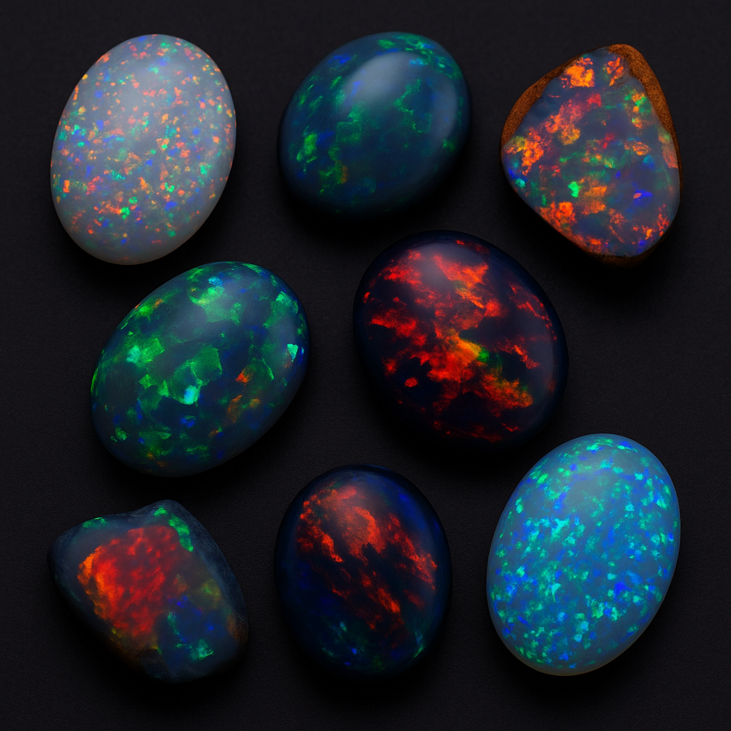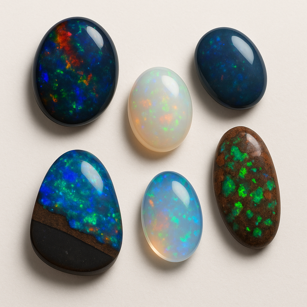 Opal comes in many natural forms, each with its own character. Black Opal is the most valuable, with bright fire on a dark base. Dark Opal shows similar contrast but with a slightly lighter tone. Light Opal has a pale or white body and soft pastel fire. Crystal Opal is translucent, with colour that seems to glow from within. Boulder Opal forms in ironstone and shows dramatic natural patterns. Matrix Opal is speckled with fire throughout the host rock. Treated opals like carbonised Andamooka and composite doublets/triplets are man-enhanced and must always be declared.