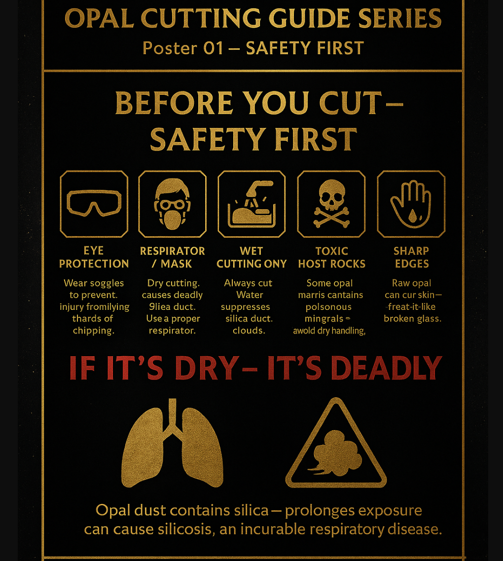 Always use water when cutting or grinding opal to suppress dust, wear proper PPE including a certified respirator, and clean up with wet methods only. Silica dust is invisible, permanent, and deadly — safety first, always.