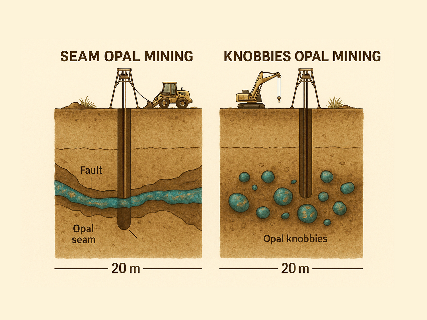 Knobby and seam opals are mined using different techniques depending on the geology of the opal field.