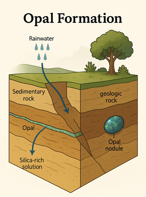 Australian opals are formed through a sedimentary process over millions of years. Unlike volcanic opals found in other countries, Australia's precious opals originate from ancient inland seas and weathered sandstone basins.